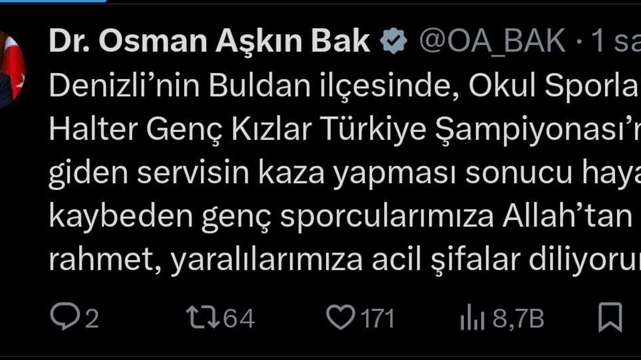 Gençlik ve Spor Bakanı Osman Aşkın Bak ise sosyal medya hesabından taziye mesajı yayımladı. Bakan Bak, "Denizli’nin Buldan ilçesinde Okul Sporları Halter Şampiyonası’na giden servisin kaza yapması sonucu hayatını kaybeden genç sporcularımıza Allah’tan rahmet, yaralılarımıza acil şifalar diliyorum" dedi.