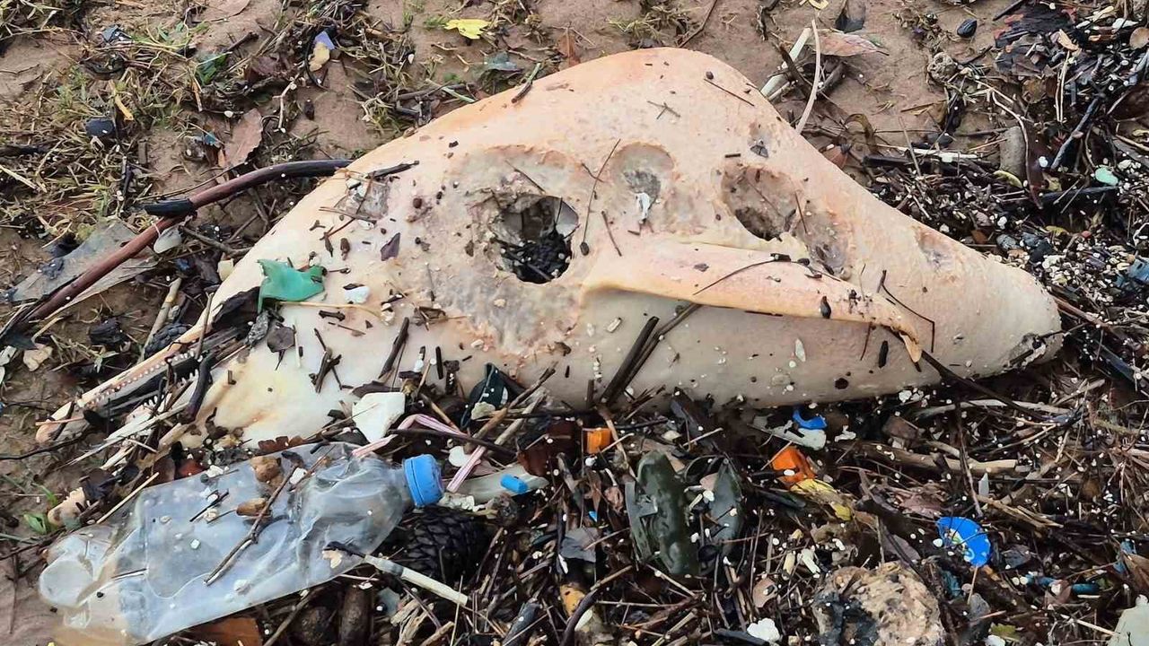 Bartın'da dev dalgalarla birlikte ölü bir yunus balığının kalıntıları sahile vurdu.