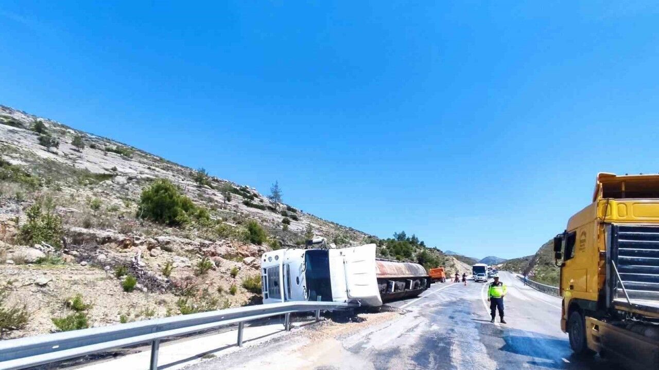 Konya-Antalya Karayolu Beydiğin Mahallesi’nde tırın devrilmesi sonucu meydana gelen kazada tırın tankerindeki zift yola saçıldı.