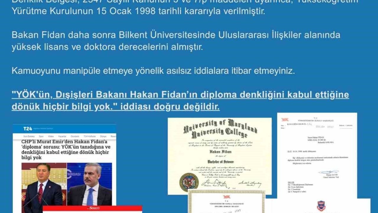 Dışişleri Bakanlığı kaynakları, Dışişleri Bakanı Fidan’ın üniversite diplomasına ilişkin gündeme getirilen iddiaları yalanlayarak, "Dışişleri Bakanı Hakan Fidan’a yönelik olarak son yıllarda FETÖ ve türevleri tarafından sistematik biçimde yapılan çok yönlü yıpratma kampanyalarında gündeme getirilen asılsız bazı iddiaların yeniden dillendirildiği görülmektedir. Esasen bu iddialara hem Dezenformasyonla Mücadele Merkezi hem de Yüksek Öğretim Kurulu belgeleriyle yanıt vermişti. Sayın Bakanımızın lisans, yüksek lisans ve doktora diplomaları ile denklik belgesi, İletişim Başkanlığı Dezenformasyonla Mücadele Merkezi tarafından 15 Mayıs 2025 tarihinde kamuoyumuzun dikkatine getirilmişti. (https://x.com/dmmiletisim/status/1922169955086434570?s=46)