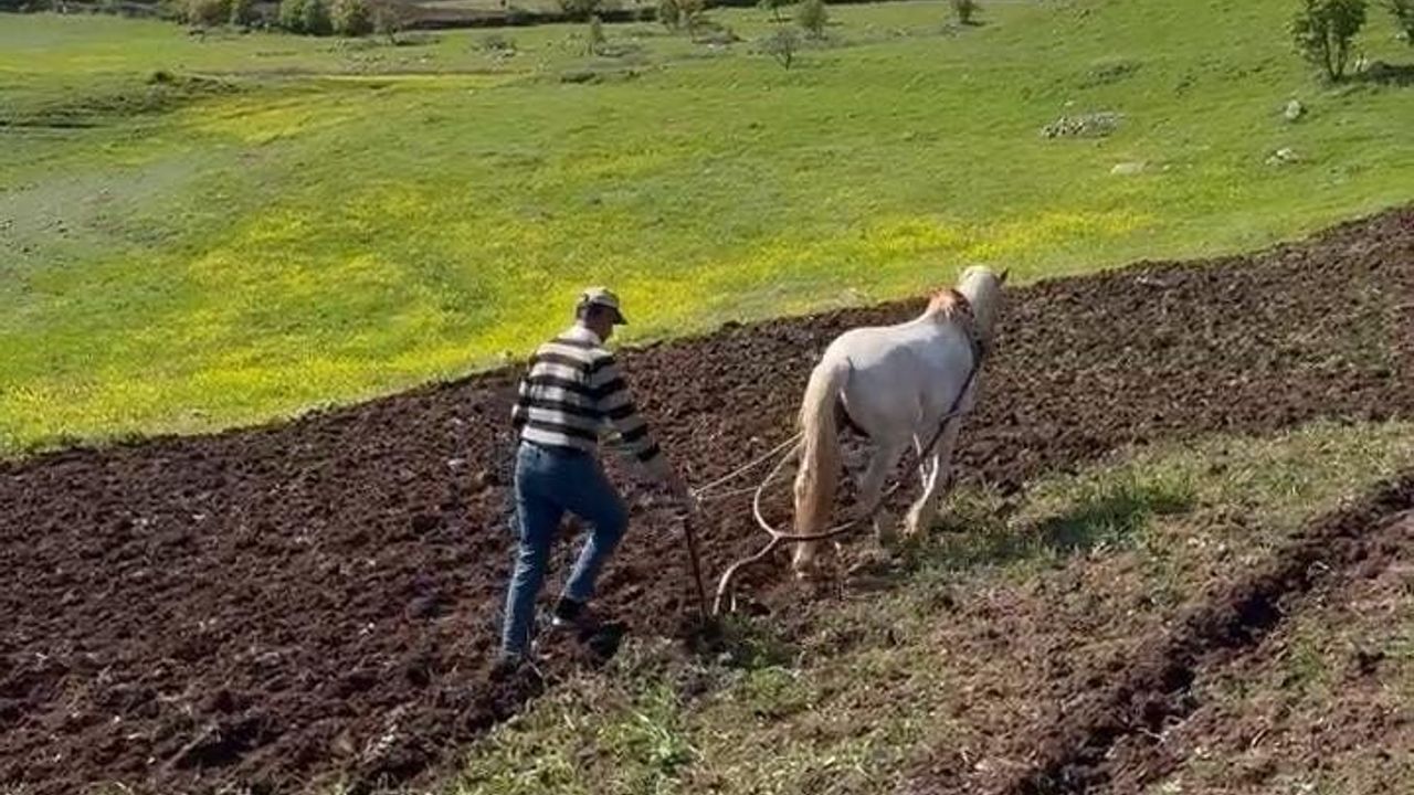 Diyarbakır’ın Dicle ilçesinde çiftçinin atla tarlasını sürdüğü anlar objektiflere yansıdı.