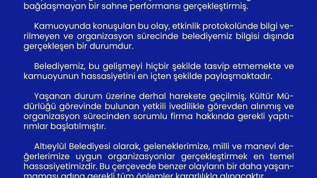 Konuyla ilgili Altıeylül Belediyesi ise açıklama yaparak gösterinin normal etkinlik akışında olmadığı ve sorumlu firma hakkında gerekli işlemlerin yapıldığını duyurdu. Altıeylül Belediyesi ayrıca Kültür Müdürünün görevden alındığını açıkladı. Altıeylül Belediyesi tarafından konuyla ilgili yapılan açıklama ise şu şekilde: "Belediyemiz tarafından 23 Nisan Ulusal Egemenlik ve Çocuk Bayramı münasebetiyle düzenlenen etkinlikler kapsamında, onaylanan program akışı dışında ve kurumsal değerlerimizle bağdaşmayan bir sahne performansı gerçekleştirmiş. Kamuoyunda konuşulan bu olay, etkinlik protokolünde bilgi verilmeyen ve organizasyon sürecinde belediyemiz bilgisi dışında gerçeklesen bir durumdur, G Belediyemiz, bu gelişmeyi hiçbir şekilde tasvip etmemekte ve kamuoyunun hassasiyetini en içten şekilde paylaşmaktadır. Yaşanan durum üzerine derhal harekete geçilmiş, Kültür Müdürlüğü görevinde bulunan yetkili ivedilikle görevden alinmiş ve organizasyon sürecinden sorumlu firma hakkında gerekli yaptırımlar başlatılmıştır. Altıeylül Belediyesi olarak, geleneklerimize, milli ve manevi değerlerimize uygun organizasyonlar gerçekleştirmek en temel hassasiyetimizdir. Bu çerçevede benzer olayların bir daha yaşanmaması adına gerekli tüm önlemler kararlıkla alınacaktır."