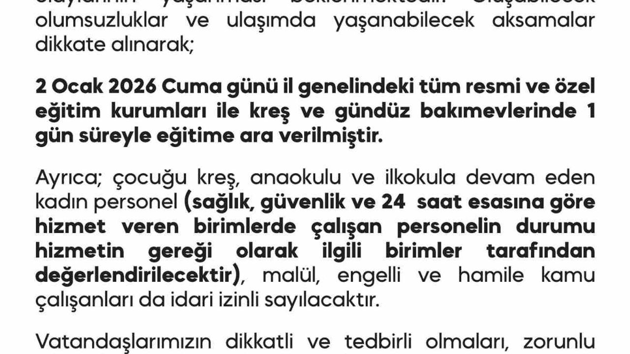 Diyarbakır Valiliğinden yapılan açıklamada, ''Meteorolojik verilere göre, 2 Ocak 2026 Cuma günü sabah saatlerinden itibaren ilimiz genelinde hava sıcaklıklarında belirgin düşüşle birlikte kuvvetli buzlanma ve don olaylarının yaşanması beklenmektedir. Oluşabilecek olumsuzluklar ve ulaşımda yaşanabilecek aksamalar dikkate alınarak 2 Ocak 2026 Cuma günü il genelindeki tüm resmi ve özel eğitim kurumları ile kreş ve gündüz bakımevlerinde 1 gün süreyle eğitime ara verilmiştir. Ayrıca çocuğu kreş, anaokulu ve ilkokula devam eden kadın personel (sağlık, güvenlik ve 24 saat esasına göre hizmet veren birimlerde çalışan personelin durumu hizmetin gereği olarak ilgili birimler tarafından değerlendirilecektir), malul, engelli ve hamile kamu çalışanları da idari izinli sayılacaktır. Vatandaşlarımızın dikkatli ve tedbirli olmaları, zorunlu olmadıkça özel araçlarıyla trafiğe çıkmamaları önemle rica olunur'' denildi.