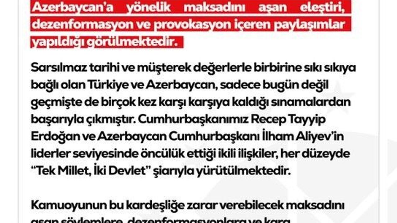 DMM'nin sosyal medya hesabından yapılan paylaşımda, 'Son günlerde bölgemizde yaşanan gelişmelerle ilişkili olarak, sosyal medya başta olmak üzere bazı mecralarda Türkiye ve Azerbaycan ilişkilerine ve Azerbaycan'a yönelik maksadını aşan eleştiri, dezenformasyon ve provokasyon içeren paylaşımlar yapıldığı görülmektedir. Sarsılmaz tarihi ve müşterek değerlerle birbirine sıkı sıkıya bağlı olan Türkiye ve Azerbaycan, sadece bugün değil geçmişte de birçok kez karşı karşıya kaldığı sınamalardan başarıyla çıkmıştır. Cumhurbaşkanımız Recep Tayyip Erdoğan ve Azerbaycan Cumhurbaşkanı İlham Aliyev'in liderler seviyesinde öncülük ettiği ikili ilişkiler, her düzeyde 'Tek Millet, İki Devlet' şiarıyla yürütülmektedir. Kamuoyunun bu kardeşliğe zarar verebilecek maksadını aşan söylemlere, dezenformasyonlara ve kara propaganda faaliyetlerine karşı daha hassas olması; kritik konularda Türkiye ve Azerbaycan makamlarınca yapılan açıklamaları dikkate alması önemle rica olunur' ifadelerine yer verildi.