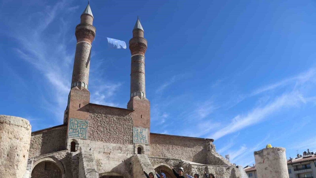 Sivas Cumhuriyet Üniversitesi öğrencileri, Doğu Türkistan’da yaşanan zulme dikkat çekmek ve farkındalık oluşturmak amacıyla tarihi Çifte Minareli Medrese’ye Türk bayrağı ile birlikte Doğu Türkistan bayrağı astı.