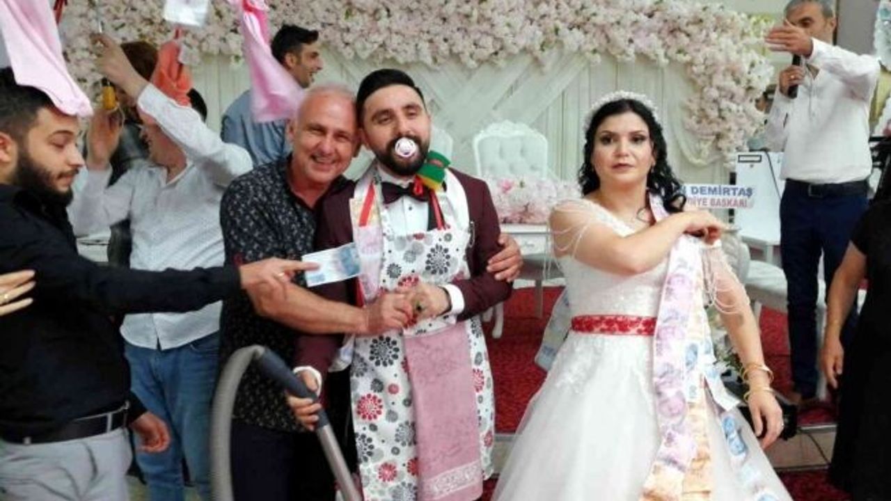 Samsun’da bir düğünde takı merasiminde damada arkadaşları tarafından elektrik süpürgesi, bulaşık deterjanı, mutfak önlüğü, kepçe ve bulaşık süngeri ile emzik takıldı.