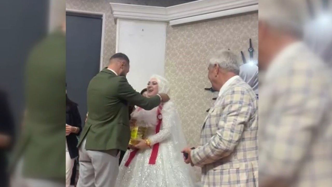 Erzincan’da düzenlenen bir nikah töreninde gelin ve damada takı merasiminde 5 litrelik Ayçiçek yağı takıldı.
