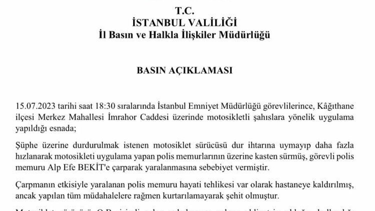 Olay, dün akşam saatlerinde Kağıthane Merkez Mahallesinde meydana geldi. Kağıthane İlçe Emniyet Müdürlüğüne bağlı motosikletli polis timlerince gerçekleştirilen denetime şüpheli bir motosikletli takıldı. Polis Memuru Alp Efe Bekit, Osman P. yönetimindeki 34 HBS 283 plakalı motosikleti durdurmak için ihtarda bulundu. İddiaya göre, motosikletli polisi görmesine rağmen dur ihtarına uymayarak aracını üzerine sürdü ve polise çarptı. Çarpmanın etkisiyle Alp Efe Bekit yola savrulup metrelerce sürüklenirken, motosiklet sürücüsü Osman P. de yaralandı. Hastanede tedavi altına alınan polis memuru Alp Efe Bekit tüm müdahaleye rağmen kurtarılamayarak şehit oldu. Osman P.’nin ise tedavisinin sürdüğü öğrenildi.