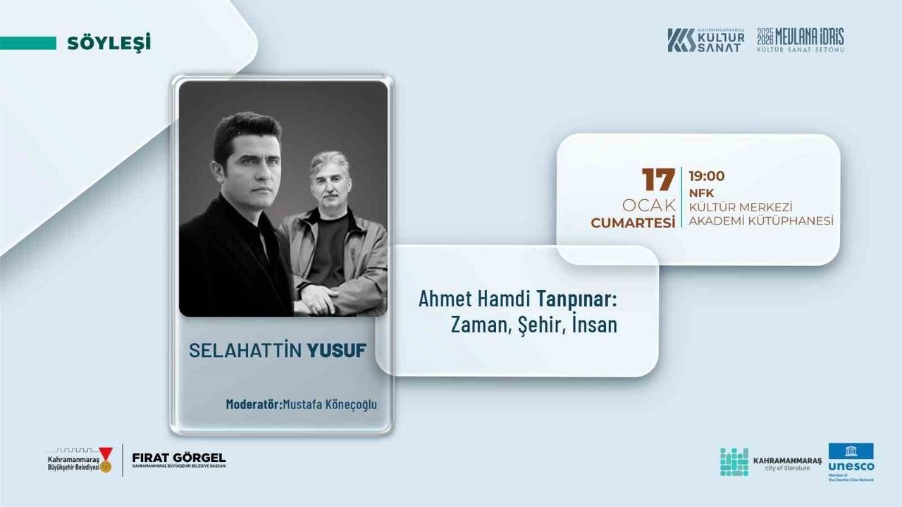 UNESCO tarafından Türkiye'de ilk kez 'Edebiyat Şehri' ünvanıyla taçlandırılan Kahramanmaraş, Büyükşehir Belediyesi'nin kültür ve sanat alanındaki nitelikli etkinlikleriyle edebiyat dünyasının nabzını tutmaya devam ediyor. Bu kapsamda Büyükşehir Belediyesi, edebiyatseverleri özel bir söyleşi programında bir araya getirecek. 17 Ocak Cumartesi günü düzenlenecek program, Necip Fazıl Kısakürek Kültür Merkezi Akademi Kütüphanesi'nde saat 19.00'da başlayacak. Söyleşide edebiyat dünyasının yakından tanıdığı yazar Selahattin Yusuf ve şehrin önemli edebiyatçılarından Mustafa Köneçoğlu kitapseverlerle buluşacak. Programda Türk edebiyatının en önemli mütefekkir ve yazarlarından Ahmet Hamdi Tanpınar'ın edebi kişiliği, eserleri ve düşünce dünyası ele alınacak. Katılımcılar, Tanpınar'ın Türk edebiyatına kazandırdığı derinlik ve estetik anlayışı üzerine kapsamlı değerlendirmeleri dinleme fırsatı bulacak.
