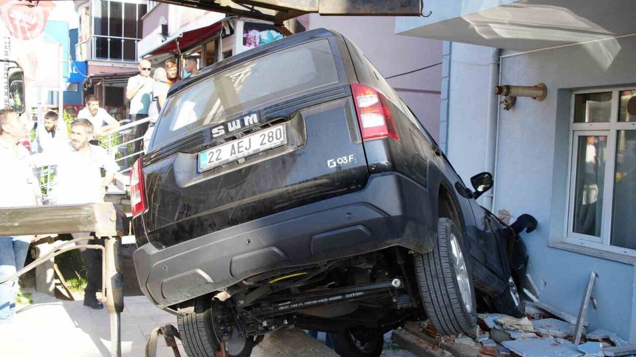Edirne’de direksiyon kontrolü kaybedilen cip bir iş yerinin balkonunu yıktı ve apartmanın duvarına çarparak askıda kaldı. 1 kişinin yaralandığı kaza anı çevrede bulunan bir iş yerinin güvenlik kamerasına yansıdı.