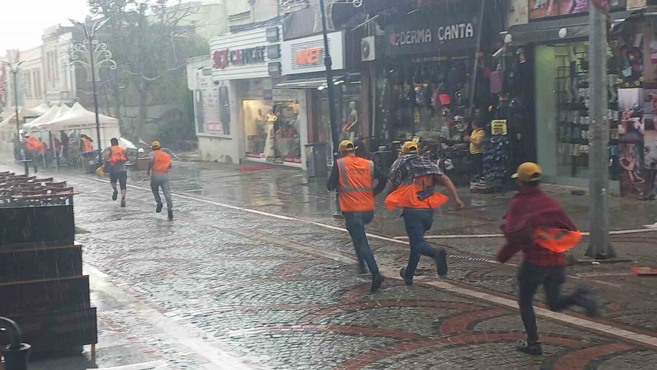 Edirne kent merkezinde öğle saatlerinde başlayan sağanak, bazı bölgelerde doluya dönüştü. Saraçlar Caddesi’nde yoğun yağış nedeniyle bazı yollar adeta göle döndü. Vatandaşlar saçak ve tente altlarında beklerken esnafın da yağan yağış ile iş yerlerinin kepenk ve yerlerini temizlediği görüldü. Yetkililer, vatandaşları olumsuz hava şartlarına karşı dikkatli olmaları konusunda uyardı.