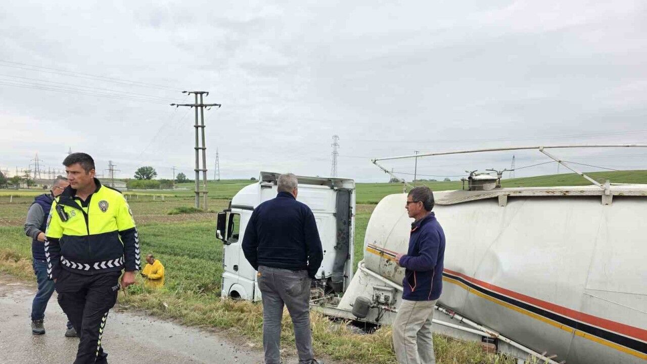 Edirne’de seyir halindeki treyler silobas tır sürücüsünün direksiyon kontrolünü kaybetmesi sonucu tarlaya devrildi. Meydana gelen kazada sürücü yaralandı.