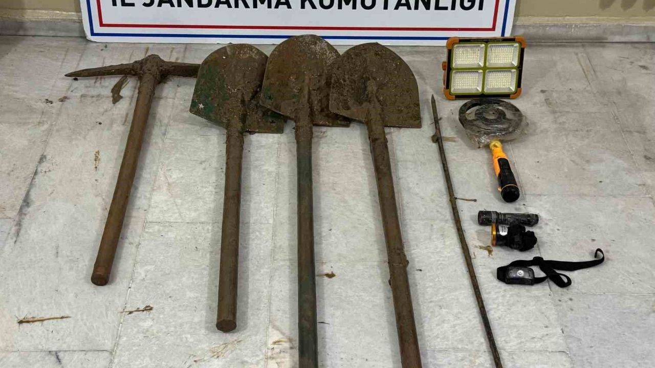 Aydın İl Jandarma Komutanlığı ve Efeler İlçe Jandarma Komutanlığınca yürütülen çalışmalar kapsamında, Kalfaköy Mahallesi'nde kaçak kazı yapıldığı tespit edildi. Bölgede gerçekleştirilen çalışma neticesinde V.A. (30), M.S. (56), M.Ş. (28), S.Y. (58) ve M.Y. (43) isimli şüpheliler kaçak kazı yaparken suçüstü yakalandı. Şüphelilerle birlikte 1 adet el dedektörü, 1 adet kazma, 3 adet kürek, 1 adet güneş paneli ve 3 adet el feneri ele geçirildi.