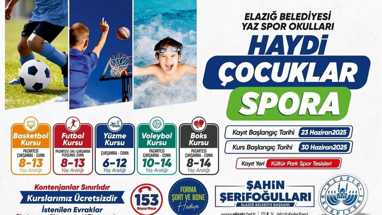 Her yıl olduğu gibi bu yaz da çocuklara yönelik ücretsiz spor kurslarıyla sağlıklı nesillerin yetişmesine katkı sunmayı hedefleyen Elazığ Belediyesi tarafından, "Haydi Çocuklar Spora" sloganıyla başlatılacak yaz spor okulları kapsamında basketbol, futbol, yüzme, voleybol ve boks branşlarında eğitimler verilecek. Elazığ Belediyesi tarafından çocukları spora yönlendirmek, kaliteli vakit geçirmelerini sağlamak ve gelişimlerine katkı sunmak amacıyla basketbol, futbol, yüzme, voleybol ve boks branşlarında ücretsiz yaz spor okulları kursu başlatılacak.