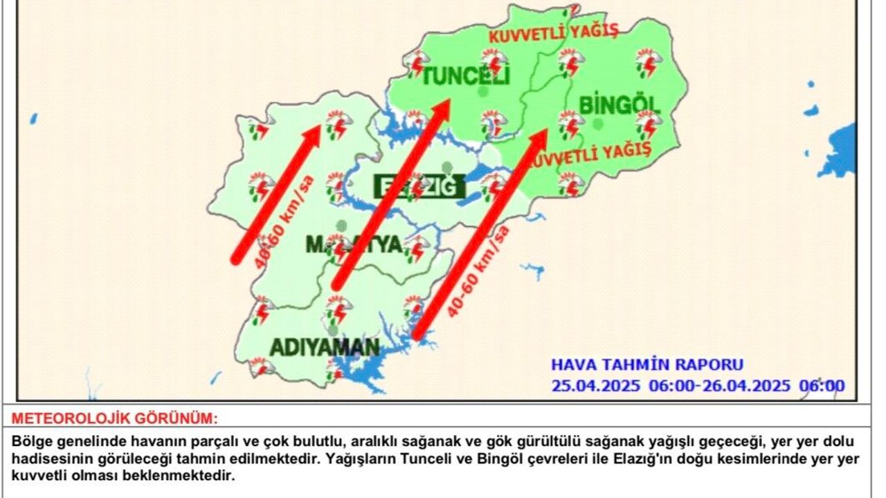 Meteoroloji 13. Bölge Müdürlüğü’nde yapılan açıklamada, "Bölge genelinde havanın parçalı ve çok bulutlu, aralıklı sağanak ve gök gürültülü sağanak yağışlı geçeceği, yer yer dolu hadisesinin görüleceği tahmin edilmektedir. Yağışların Tunceli ve Bingöl çevreleri ile Elazığ’ın doğu kesimlerinde yer yer kuvvetli olması beklenmektedir. Yağışların, Tunceli ve Bingöl çevreleri ile Elazığ’ın doğu kesimlerinde yer yer kuvvetli olması beklendiğinden yaşanabilecek olumsuzluklara karşı dikkatli ve tedbirli olunması gerekmektedir. Rüzgarların güneyli yönlerden yer yer kuvvetli (40-60 km/sa) esmesi beklendiğinden yaşanabilecek olumsuzklara karşı dikkatli ve tedbirli olunması gerekmektedir" denildi.