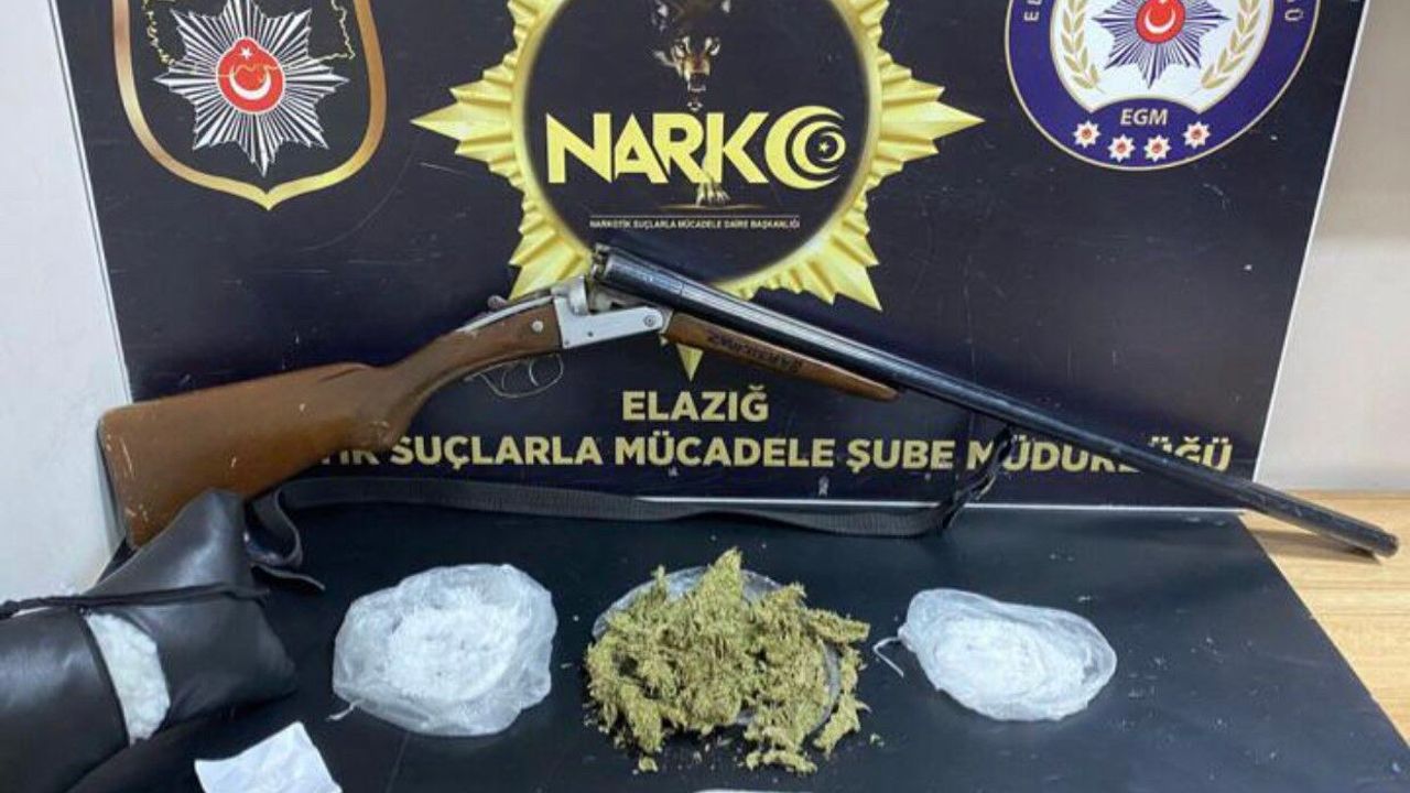 Elazığ Cumhuriyet Başsavcılığı koordinesinde İl Emniyet Müdürlüğü Narkotik Suçlarla Mücadele Şube Müdürlüğü tarafından uyuşturucu ile mücadele çerçevesinde sokak satıcılarına yönelik çalışma gerçekleştirildi. Çalışmada 2 şüpheli yakalanarak gözaltına alındı. Şüphelilerin ikametlerinde yapılan aramada, 2 parça halinde 31 gram Metamfetamin maddesi, araç yastık kılıfı içerisine gizlenmiş 2 parça halinde 1,16 gram Metamfetamin maddesi, 2 parça halinde 56 gram esrar maddesi, 1 adet tüfek ele geçirildi.