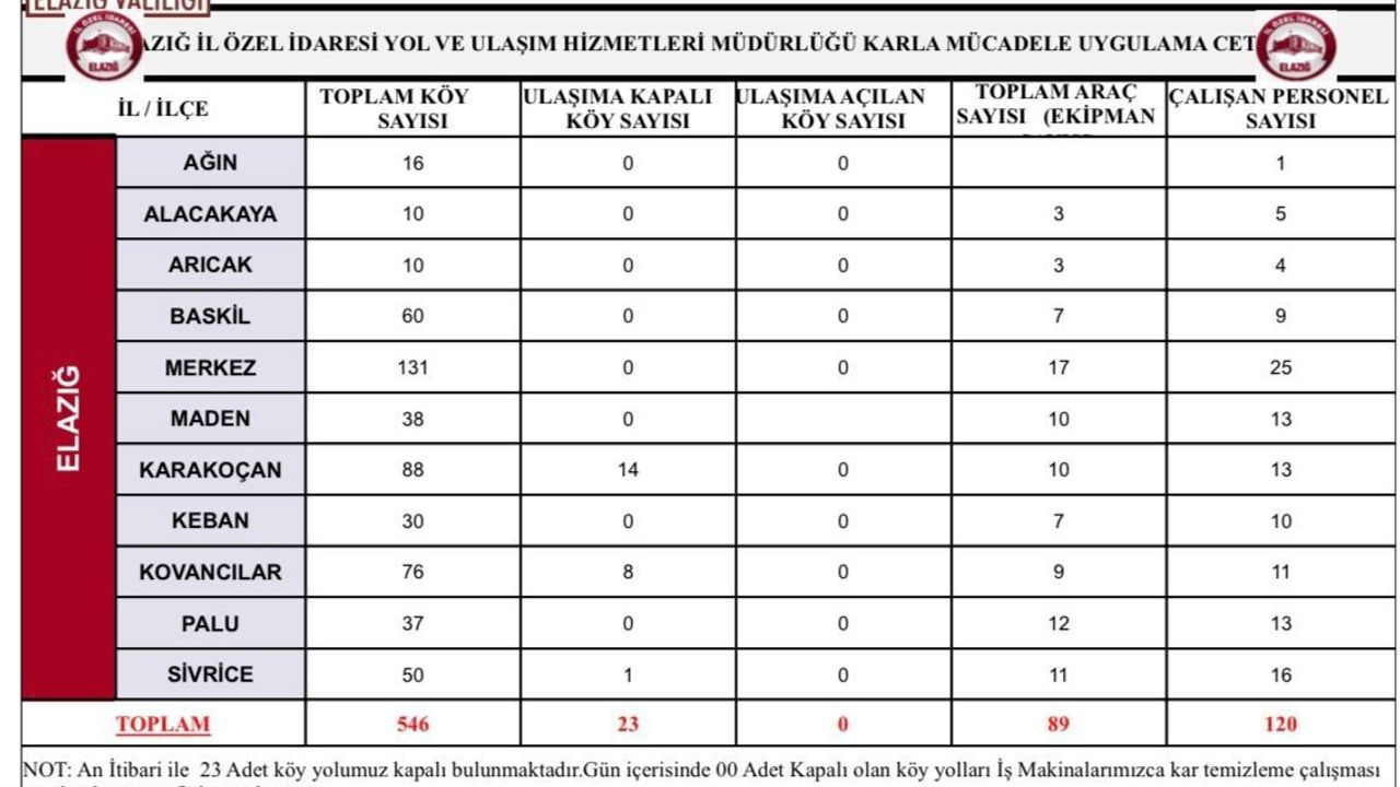 Elazığ'ın yüksek kesimlerinde etkili olan kar yağışı nedeniyle bazı köy yolları ulaşıma kapandı. Elazığ İl Özel İdaresi Yol ve Ulaşım Hizmetleri Müdürlüğü ekipleri, kapalı yolların açılması için çalışmalarını aralıksız sürdürüyor. İl genelinde toplam 546 köy yolundan 23'ünün kar yağışı nedeniyle ulaşıma kapalı olduğu bildirildi. Karakoçan ilçesinde 14, Kovancılar'da 8, Sivrice'de ise 1 köy yolu ulaşıma kapalı bulunuyor. İl Özel İdaresi ekipleri, karla mücadele kapsamında 89 araç ve 120 personel ile sahada çalışmalarını sürdürüyor.