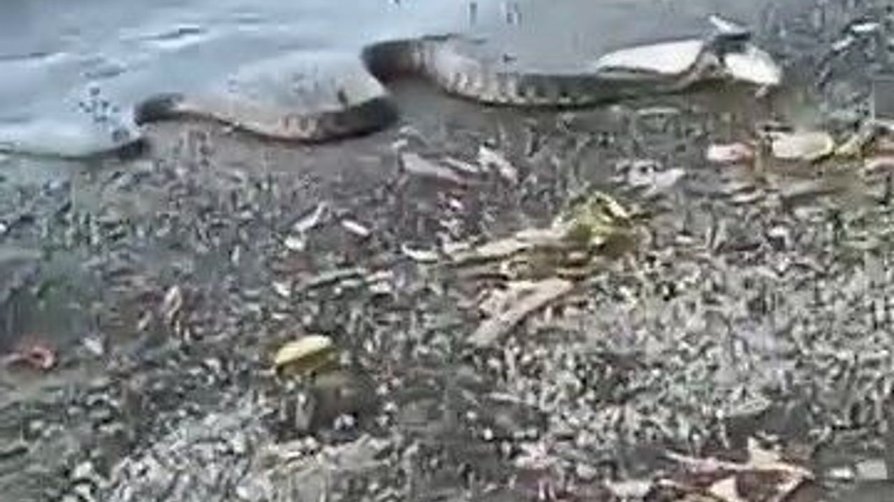 Elazığ’da bir yılan avladığı balığı kıyıya çıkardı. Vatandaşlardan rahatsız olan balık tekrar balığı alarak suya döndü, o anlar cep telefonu kamerasın yansıdı.