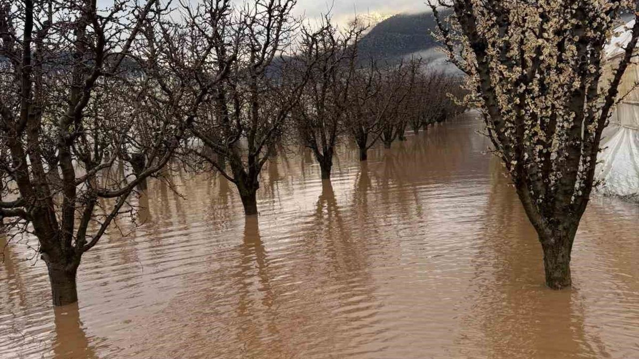 Antalya'nın Elmalı ilçesinde gece saatlerinde sağanak nedeniyle dereler taştı, bazı tarım arazileri sular altında kaldı.