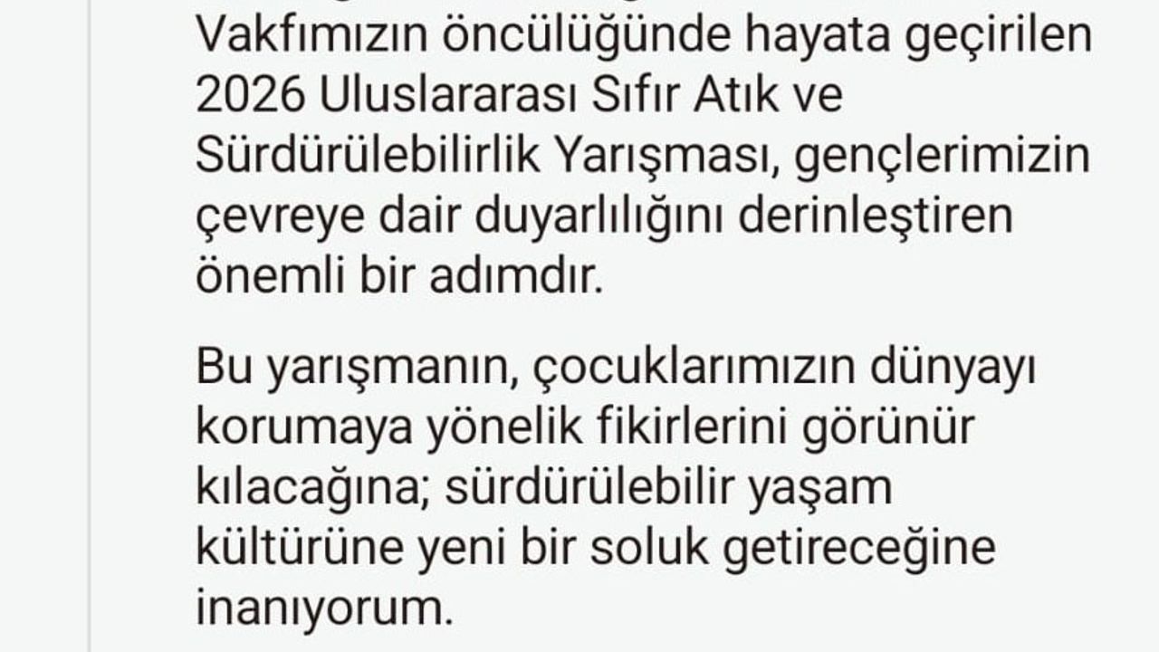 "Milli Eğitim Bakanlığımız ile Sıfır Atık Vakfımızın öncülüğünde hayata geçirilen 2026 Uluslararası Sıfır Atık ve Sürdürülebilirlik Yarışması, gençlerimizin çevreye dair duyarlılığını derinleştiren önemli bir adımdır. Bu yarışmanın, çocuklarımızın dünyayı korumaya yönelik fikirlerini görünür kılacağına; sürdürülebilir yaşam kültürüne yeni bir soluk getireceğine inanıyorum. Emeği geçen herkese teşekkür ediyor, tüm katılımcılara gönülden başarılar diliyorum."