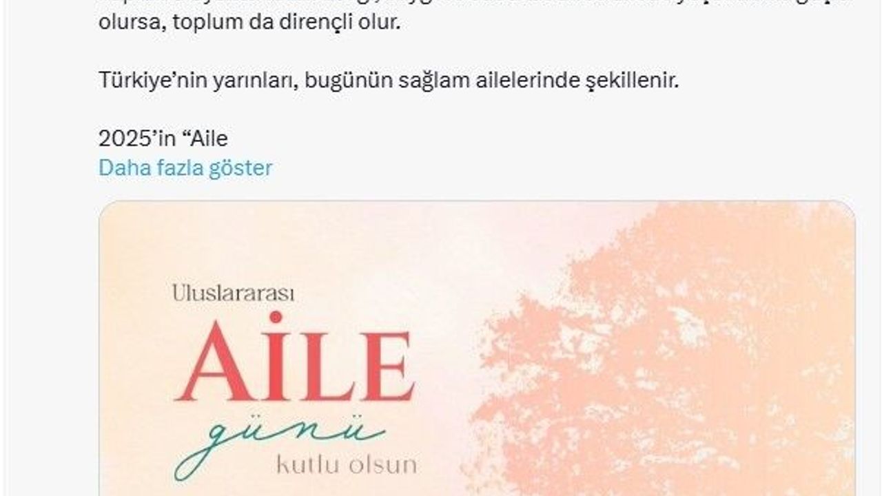 "Türkiye’nin yarınları, bugünün sağlam ailelerinde şekillenir. 2025’in Aile Yılı ilan edilmesi de bu bilinçle atılmış çok önemli bir adım. Uluslararası Aile Günü vesilesiyle bu anlamlı kararı bir kez daha vurguluyor, aile kurumunun her şartta korunmasını hayati bir görev olarak görüyorum. Zira aileye sahip çıkmak, ortak geleceğimize sahip çıkmaktır. Her birimizin sorumluluğu, aile bağlarını yaşatmak ve güçlendirmektir. Ailelerimizi hep birlikte koruyalım, birlikte büyütelim. Unutmamalıyız ki Türkiye’nin gücü, ailelerin birliğinden doğar."