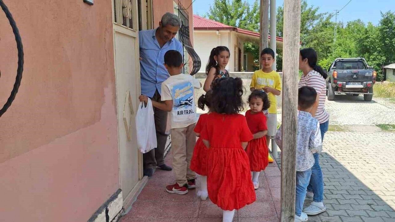 Erzincan’ın Çağlayan Beldesinde yaşayan çocuklar hep birlikte kapı kapı dolaşıp şeker toplarken, ellerindeki şeker kapları ile çocukları bekleyen belde halkı geleneği devam ettirmenin mutluluğunu yaşıyor.