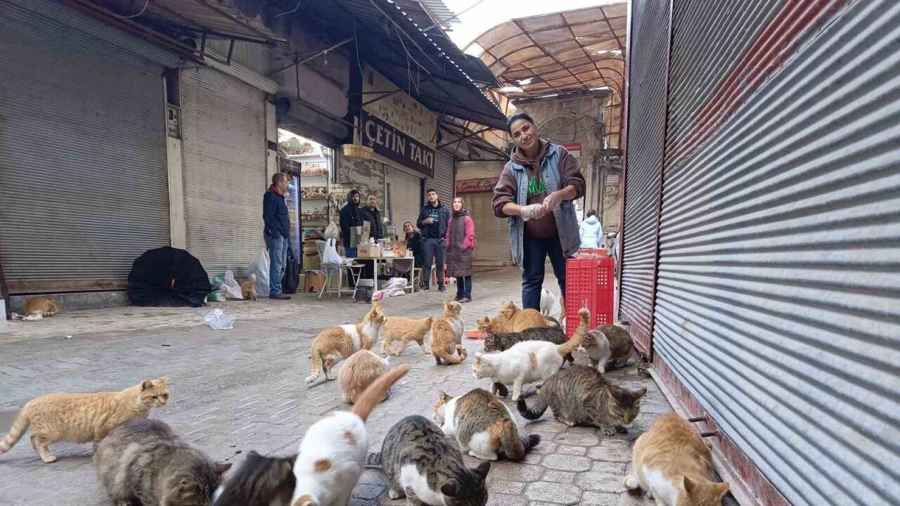 Asrın felaketinin yerle bir ettiği Hatay’da sokak hayvanları da adeta kimsesiz kalmıştı. Antakya ilçesinin merkezi noktalarında nüfusun azalmasıyla birlikte kediler, yiyecek bulmakta güçlük çekmeye başlamıştı. Sokak hayvanlarını unutmayan devlet kurumları ve hayvansever vatandaşlar oldu. Antakya’da bulunan tarihi Uzun Çarşı’da esnaflık yapan Emine Çayırcık da bu hayvanseverlerden birisi ve günlük 50 kediyi besliyor. Eline ciğeri almasıyla ’pisi pisi’ diyerek onlarca kediyi başına toplayan Çayırcık, yaptığıyla da görenlerin dikkatini çekiyor.