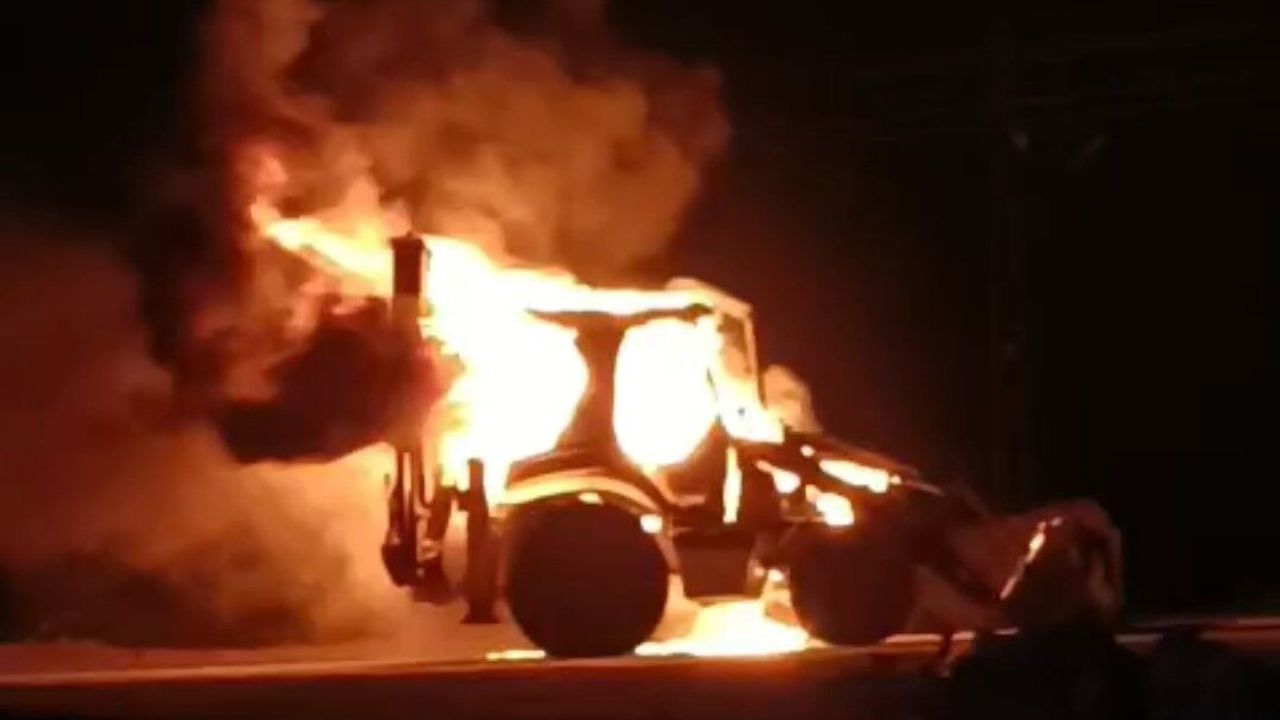 Van’ın Erciş ilçesinde seyir halinde iken alev alev yanan iş makinesi itfaiye ekipleri tarafından söndürülürken, iş makinesinden geriye hurda yığını kaldı.