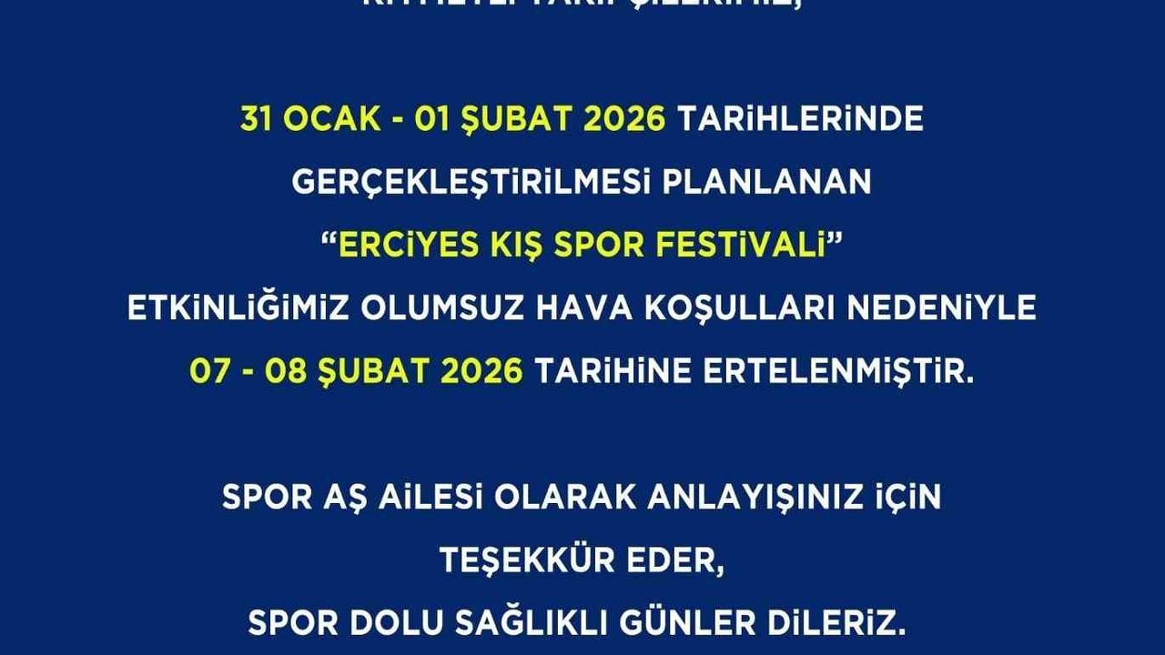 Spor A.Ş. tarafından yapılan paylaşımda, '31 Ocak - 01 Şubat 2026 tarihlerinde gerçekleştirilmesi planlanan 'Erciyes Kış Spor Festivali' etkinliğimiz olumsuz hava şartları nedeniyle 07-08 şubat 2026 tarihine ertelenmiştir. Spor A.Ş. ailesi olarak anlayışınız için teşekkür eder, spor dolu sağlıklı günler dileriz' ifadelerine yer verildi.