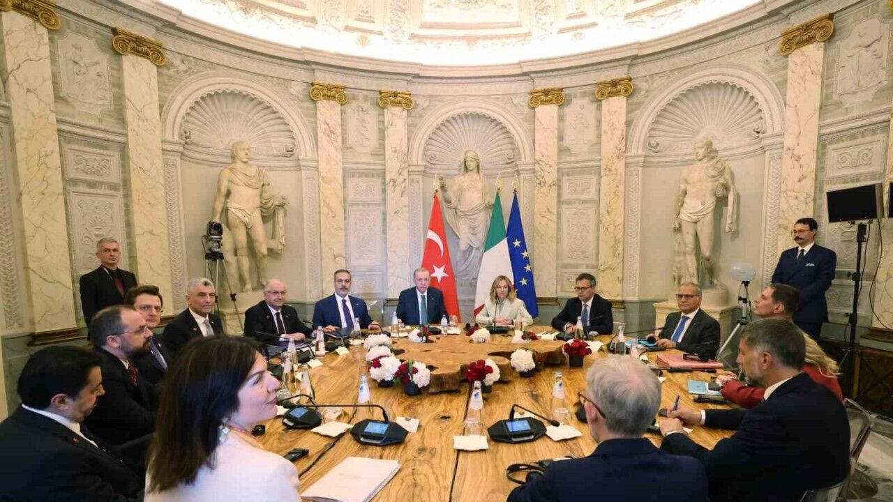 Cumhurbaşkanı Recep Tayyip Erdoğan, Roma temaslarını sürdürüyor. İtalya Başbakanı Giorgia Meloni ile ikili görüşme gerçekleştiren Erdoğan daha sonra heyetler arası görüşmeye geçti. Erdoğan ve Meloni, heyetler arası görüşmelerine başkanlık etti. Roma’daki tarihi Villa Doria Pamphili rezidansında gerçekleştirilen toplantıda Türk heyetinde Cumhurbaşkanı Erdoğan’ın yanı sıra Dışişleri Bakanı Hakan Fidan, Milli Savunma Bakanı Yaşar Güler, Ticaret Bakanı Ömer Bolat da hazır bulundu.