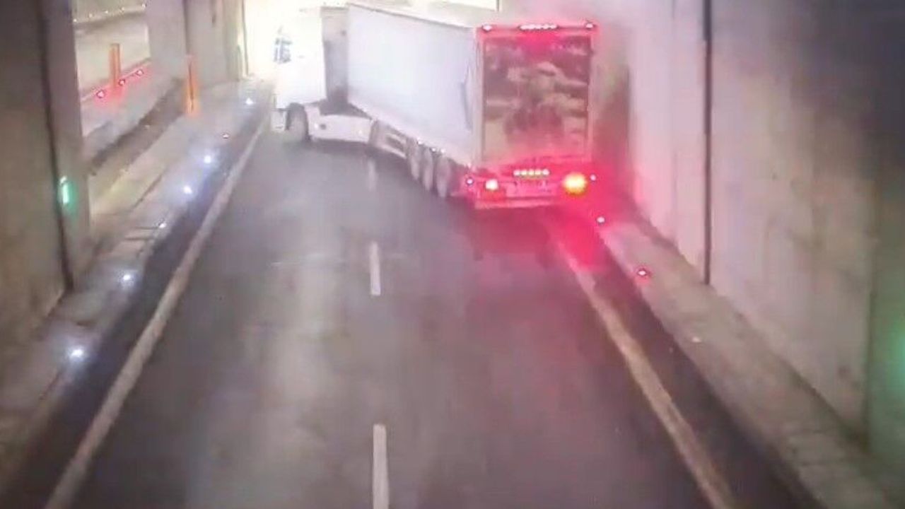 Görüntülerde tırın kontrolden çıkarak hızla tünel duvarına çarptığı anlar net bir şekilde görülüyor. Kaza anının saniye saniye kaydedildiği video, izleyenlerin yüreğini ağzına getirdi.