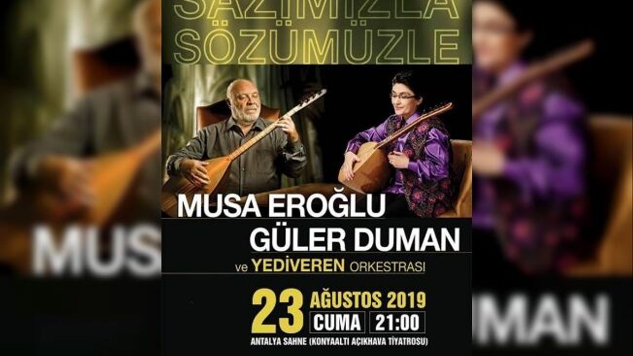 Musa Eroğlu ve Güler Duman, 'Sazımızla Sözümüzle' turnesi kapsamında 23 Ağustos Cuma gecesi saat 21.00'de, Konyaaltı Açıkhava Tiyatrosu'nda sevenleriyle buluşacak. İki ustaya, Yediveren Orkestrası eşlik edecek. Yaklaşık 2 saat sahnede kalacak olan ikili, Türk Halk Müziği'nin unutulmaz türkülerini seslendirecek.