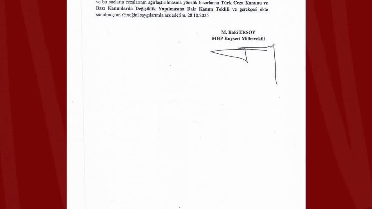 Milliyetçi Hareket Partisi (MHP) Kayseri Milletvekili Baki Ersoy, kadınlara ve çocuklara yönelik işlenen suçlara indirim yapılmamasına dair kanun teklifinde bulundu.