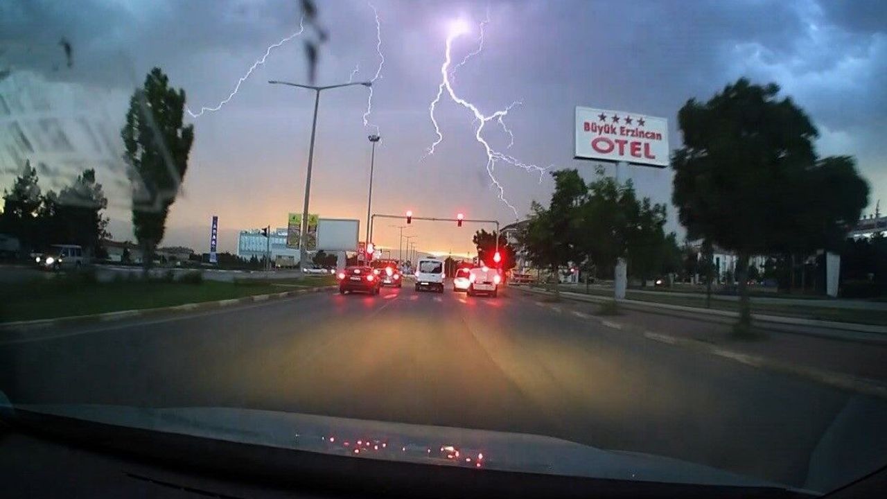 Erzincan’da gök gürültülü sağanak yağış etkili oldu. Art arda çakan şimşekler araç kamerasına yansıdı.