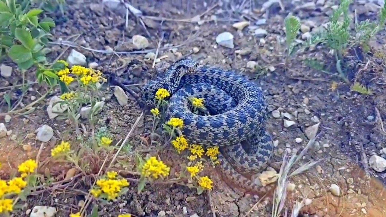 Erzincan’da sıcak havanın iyice artmasıyla birlikte canlanan doğada yılanlar da görülmeye başladı. Çayırlı ilçesine bağlı Çilhoroz köyü yaylalarında çobanlık yapan Mert Yılmaz, sürüsünü otlatırken, Türkiye’nin en zehirli yılan türlerinden engerek yılanını fark etti. Yılmaz, o anları kamerayla kayıt altına aldı. Görüntülenen koca engerek yılanı daha sonra gözden kayboldu.