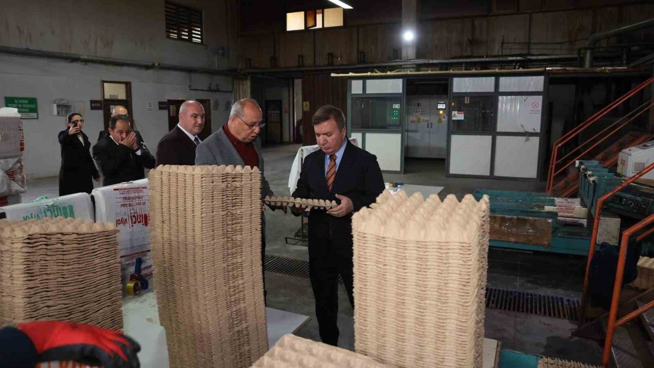 Üretim alanlarını gezen Vali Aydoğdu, tesiste 20 ve 30 adetlik yumurta viyollerinin üretim aşamalarını yerinde inceledi.