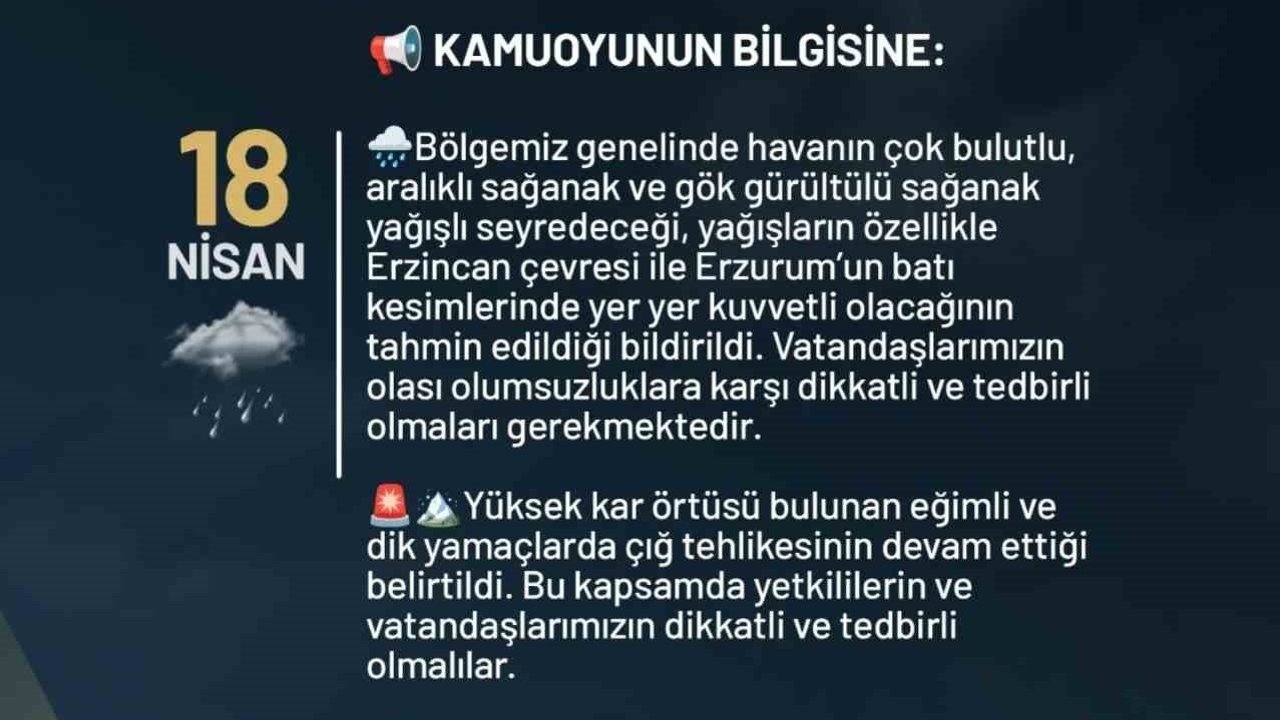 Bölge genelinde havanın çok bulutlu, aralıklı sağanak ve gök gürültülü sağanak yağışlı seyredeceği, yağışların özellikle Erzincan çevresi ile Erzurum'un batı kesimlerinde yer yer kuvvetli olacağının tahmin edildiği bildirildi. Yapılan açıklamada, daha sonra şöyle denildi, 'Yüksek kar örtüsü bulunan eğimli ve dik yamaçlarda çığ tehlikesinin devam ettiği belirtildi. Bu kapsamda yetkililerin ve vatandaşlarımızın dikkatli ve tedbirli olmalılar'