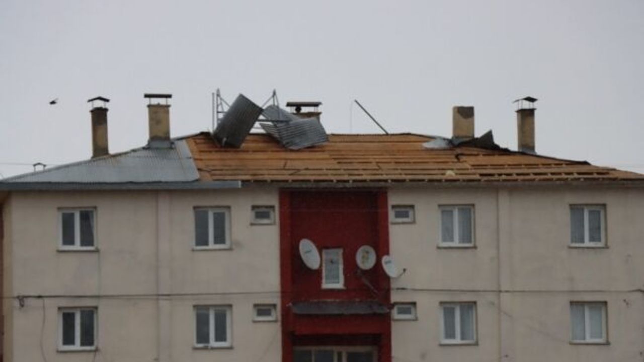 Erzurum’un Çat ilçesinde etkili olan şiddetli rüzgar ve fırtına çok sayıda binanın çatısının uçmasına neden oldu.