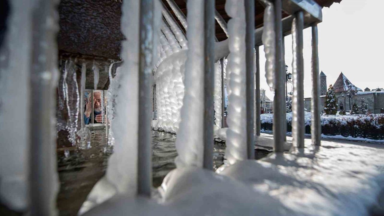 Erzurum'da kar yağışı sonrası soğuk havalar tekrar etkili olmaya başladı. Kent merkezinde şadırvan ve çeşmeler dondu.
