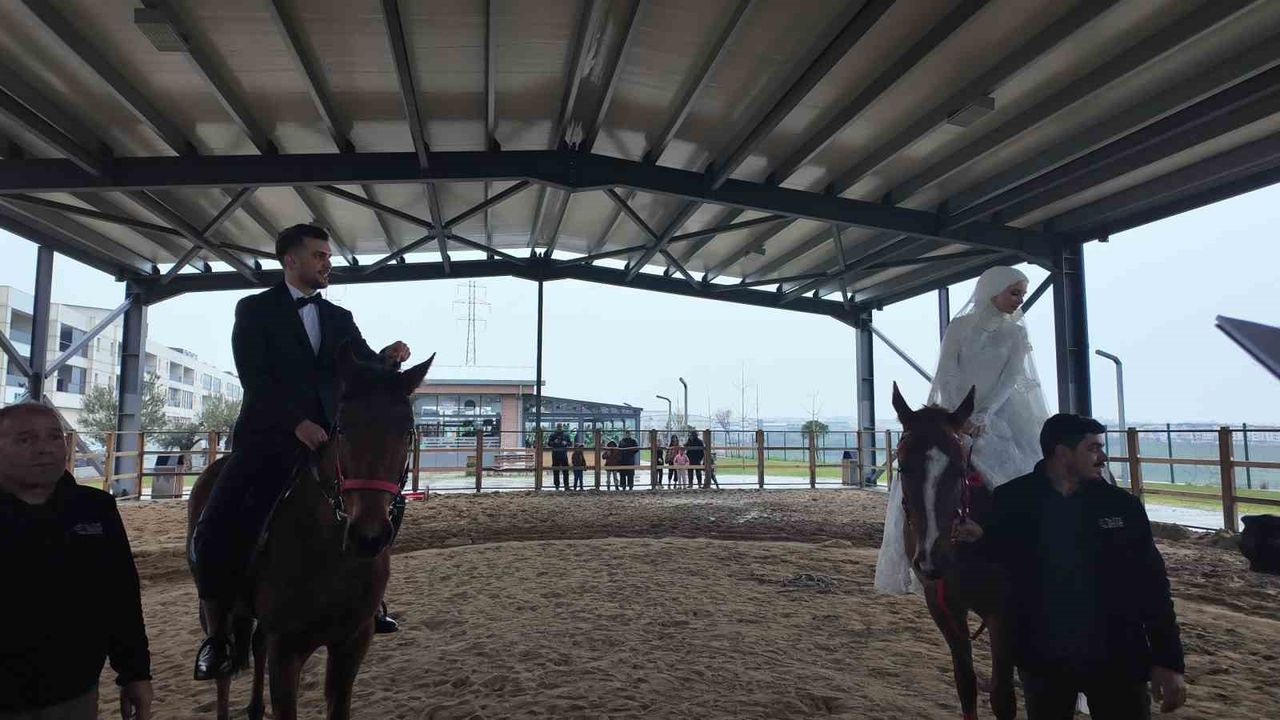 İstanbul Esenyurt'ta belediyeye ait at binicilik tesisinde tanışan genç çift, hayatlarını birleştirme kararını sıra dışı bir nikah töreniyle gerçekleştirdi. At sevgisiyle başlayan muhabbetlerini evliliğe taşıyan genç çift, nikahı at üzerinde kıyarak unutulmaz bir an yaşadı.