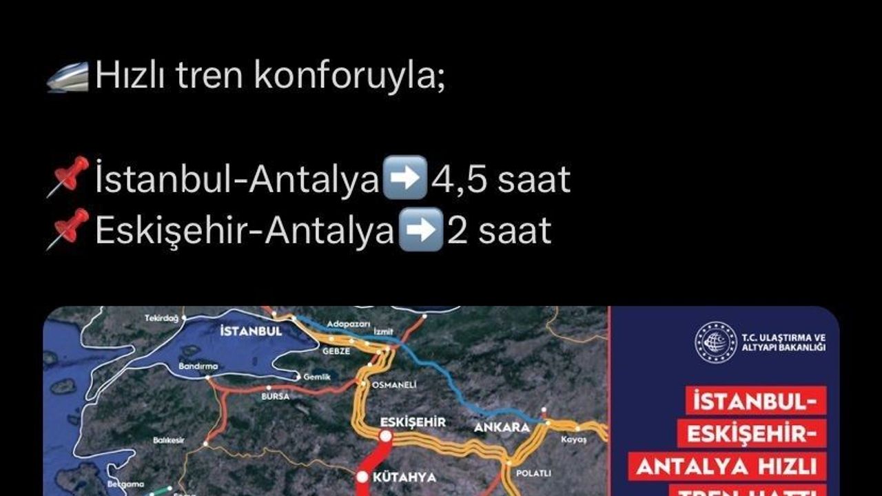 Ulaştırma ve Altyapı Bakanı Adil Karaismailoğlu, sosyal medya üzerinden yaptığı paylaşım ile Eskişehir-Antalya arası ulaşımın hızlı tren ile 2 saate düşeceğini duyurdu.