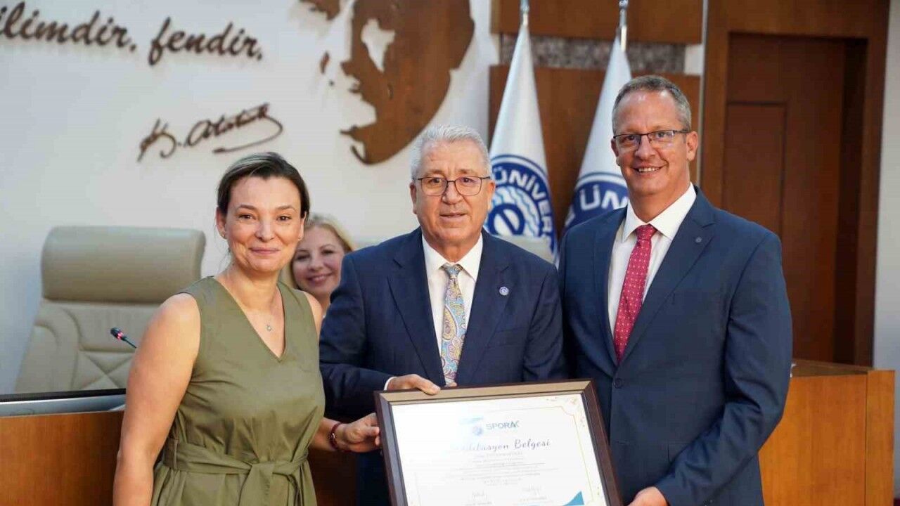 Ege Üniversitesi Rektörü Prof. Dr. Necdet Budak, senato toplantısında akreditasyon belgesini Spor Bilimleri Fakültesi Dekanı Prof. Dr. Gülbin Rudarlı ve Spor Bilimleri Fakültesi Öğretim Üyesi Prof. Dr. Timuçin Gencer’e takdim etti.