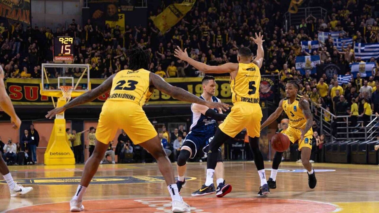 Aris: Ronnie Harrell 10, Bryce Jones 16, Elijah Mitrou-Long 15, Amine Noua 9, Steven Enoch 4, Arnoldas Kulboka 11, Jakob Forrester 7, Bryn Forbes 1, Stelios Poulianitis 2, Eleftherios Bochoridis 1, Stelios Poulianitis 2