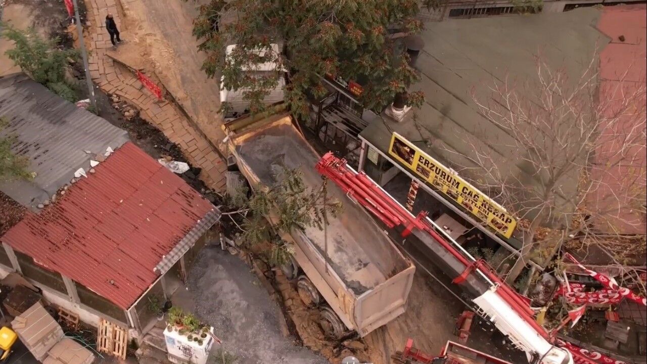 İstanbul Eyüpsultan’da elektrik çalışması hattında yapılan kazı alanına düşen hafriyat kamyonu, vinç yardımıyla bulunduğu yerden kaldırıldı. Hafriyat kamyonunu kaldırma çalışmaları havadan görüntülendi.