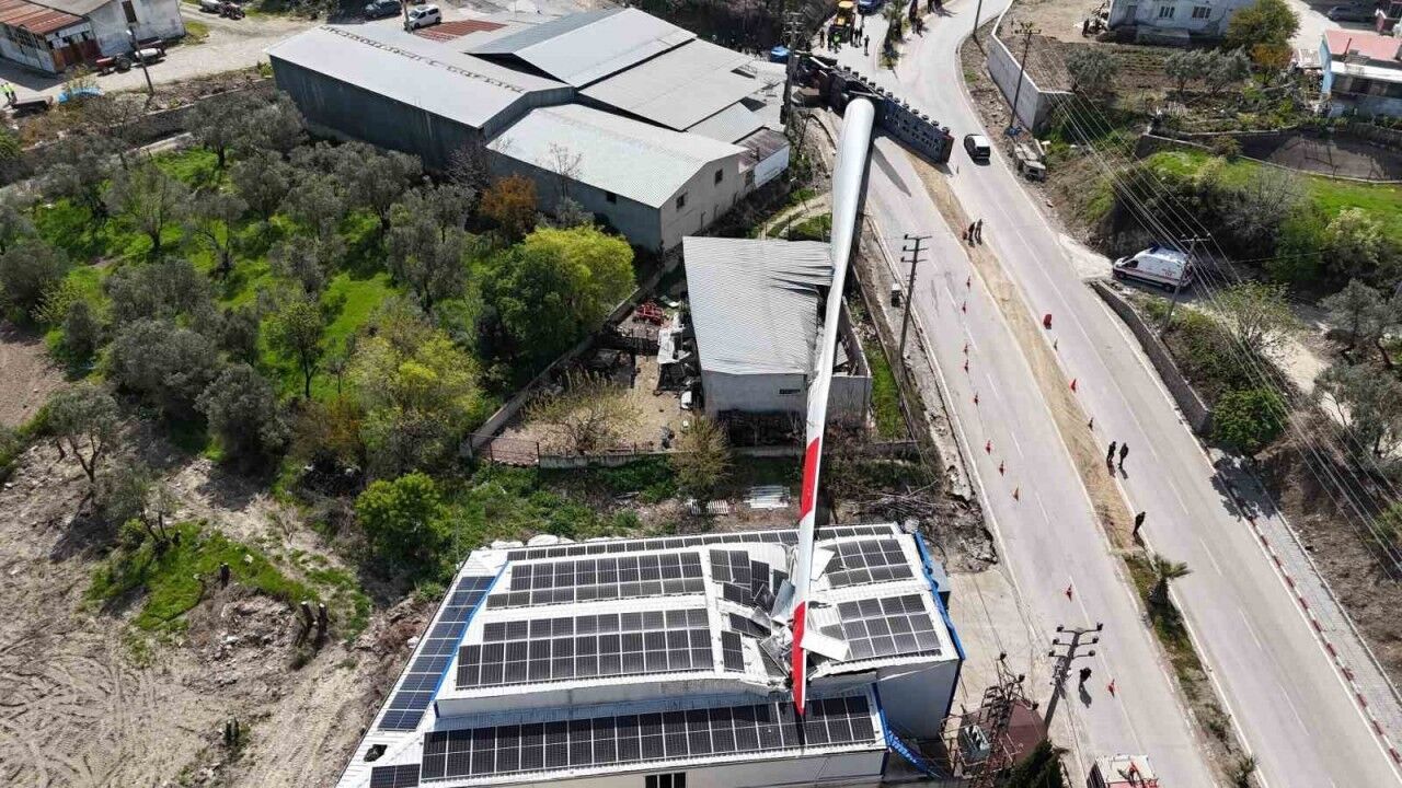 Çanakkale’de devrilen tırın taşıdığı rüzgar gülü kanadının plastik sandık fabrikası üzerine yıkıldığı kaza dronla görüntülendi. Kazada 75 metrelik kanat fabrika ile bir dama zarar verdi.