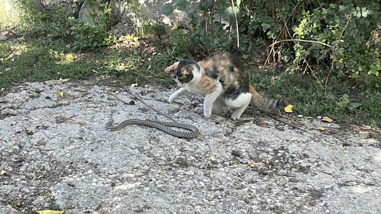Görüntülerde, kedinin yılana yaklaşarak dikkatlice izlediği, ardından da pati darbeleriyle saldırdığı görülüyor. Bir süre karşı koymaya çalışan yılan, kedinin darbeleri sonrası hareketsiz kaldı. Kedi, öldürdüğü yılanı ağzına alarak, çevredeki eski bir yapının çatısına çıktı.