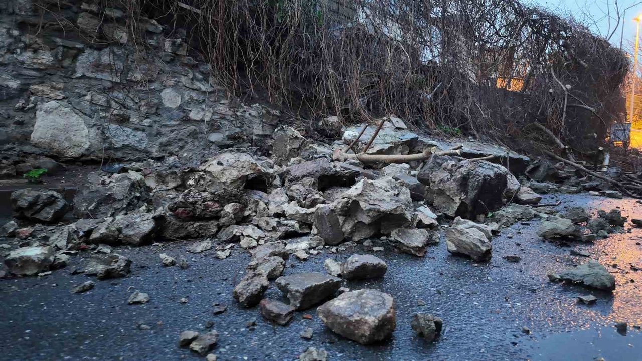 Fatih'te sağanak yağışın etkisiyle bir istinat duvarı sokağa yıkıldı. İhbar üzerine olay yerine gelen itfaiye ekipleri, hatalı park yapan tur otobüsü nedeniyle zor anlar yaşadı.