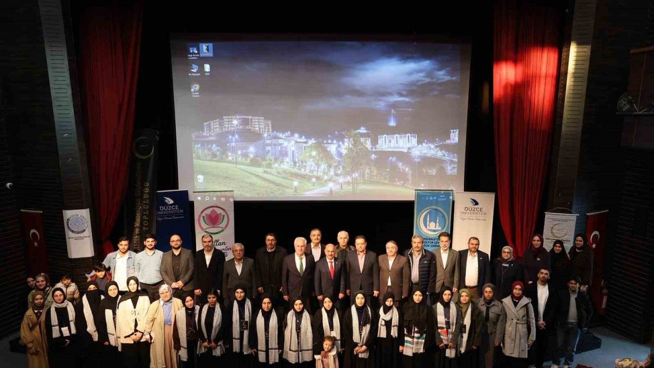 Düzce Üniversitesi Ahlak ve Maneviyatı Güçlendirme Topluluğu tarafından düzenlenen "Gazze Üzerine Düşünceler" başlıklı konferans, İstiklâl Konferans Salonu’nda yoğun bir katılımla gerçekleştirildi. Sultan Hanımlar Derneği’nin katkıları, Ahlak ve Maneviyatı Güçlendirme Topluluğu iş birliğiyle hazırlanan etkinlikte, Filistin’de yaşanan insani dram ve küresel tepkisizlik ele alındı.