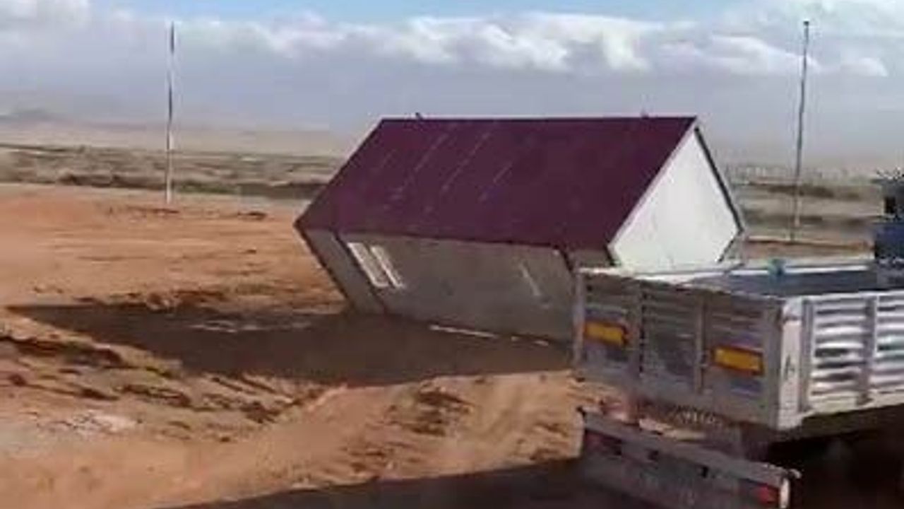 Sivas’ta şiddetli fırtınaya dayanamayan konteyner ev kağıt gibi savruldu.