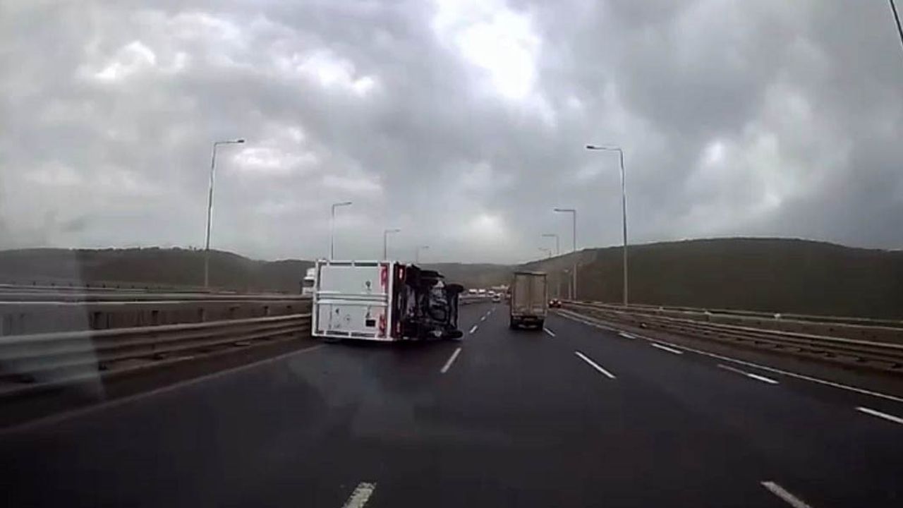 Kuzey Marmara Otoyolu'nun Kocaeli geçişinde seyir halindeki kamyonetin fırtına nedeniyle devrildiği anlar güvenlik kamerasına yansıdı.